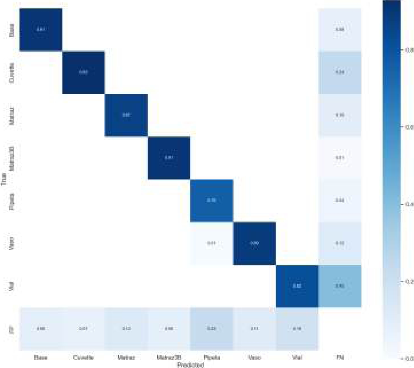 The confusion matrix shown in figure 8 reveals values greater than 0.75 on the diagonals, indicating high classification accuracy. Furthermore, the values of false positives (FP) and false negatives (FN) are very low, which confirms the reliability of our model.