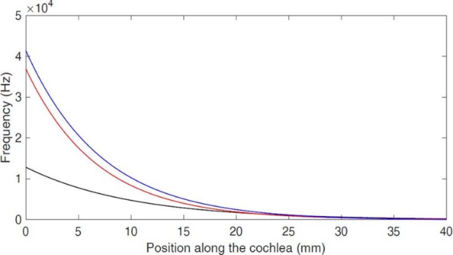 where f is frequency (Hz), x is the distance from the apex of the cochlea (helicotrema end), A=165.4, a=0- 01, and k=1 are coefficients [31]. a is the gradient of high frequency end of the map, i.e., the coefficient of the derivative evaluated at the highest frequency, A is a constant which shifts the curve as a whole for a long the log-frequency axis, and k is constant, which introduces curvature into the frequency position function so as to fit low-frequency data.