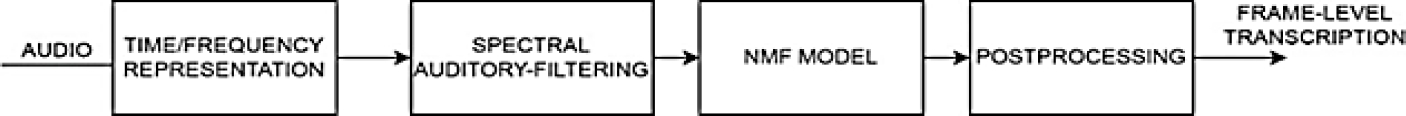 Figure 3 shows the diagram for the polyphonic music transcription using NMF algorithm. Our propose consists in add the spectral auditory-filtering block to modify the time/frequency representation (spectrogram of the signal) but using an auditory bank-filters, where central frequencies of each filter is obtained according to the equations (3,4,6).