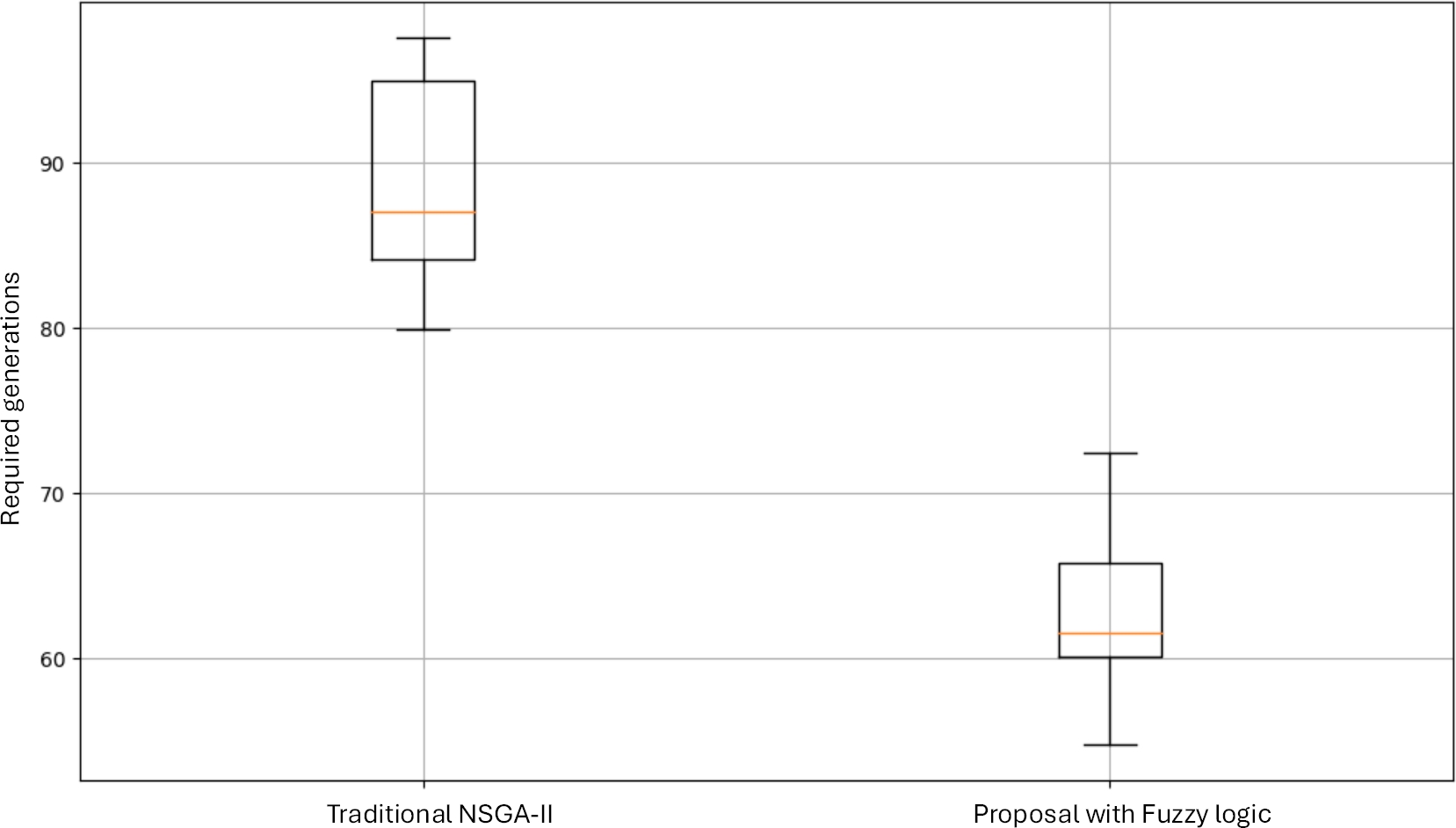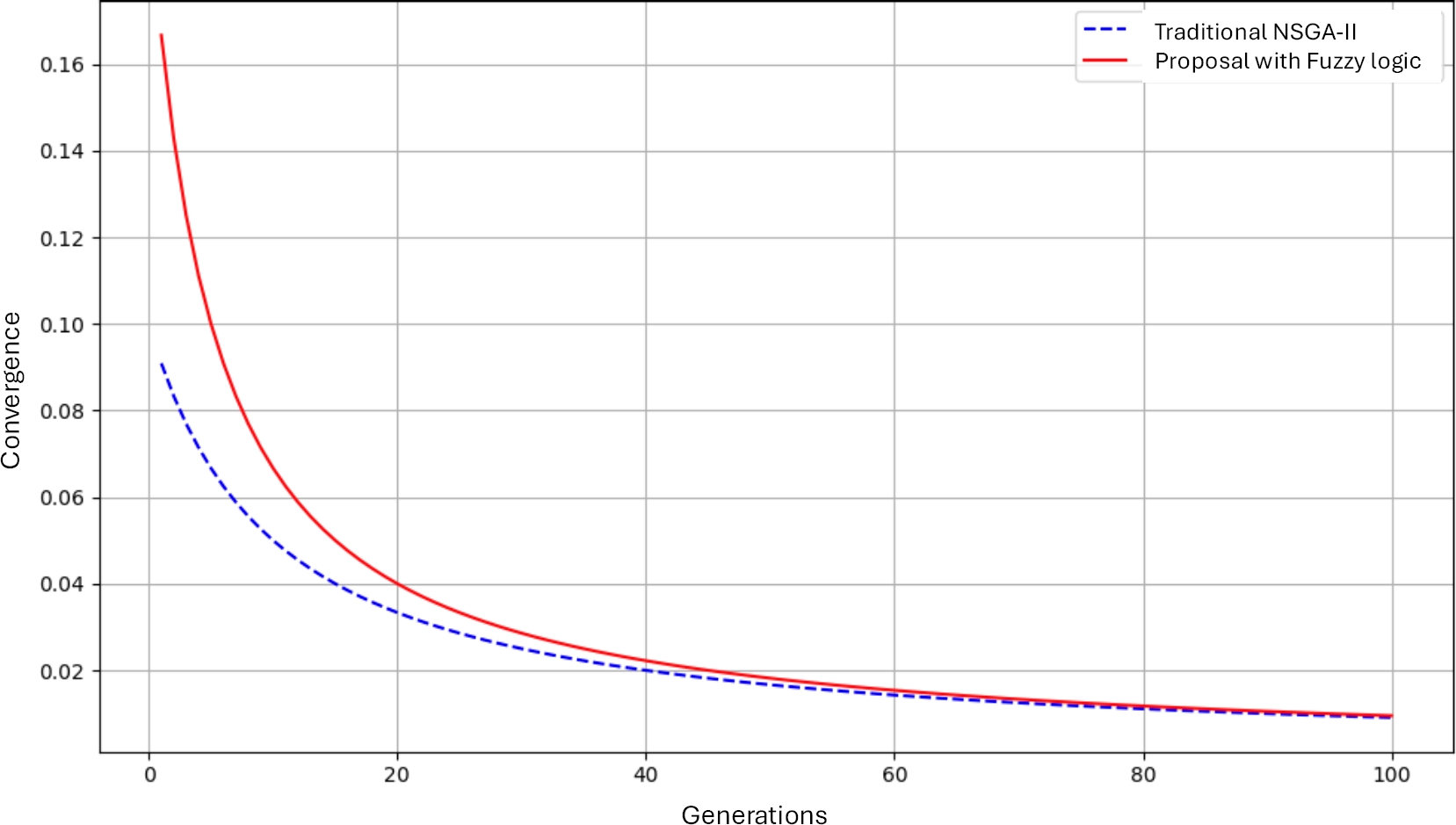 — [10] explored the integration of fuzzy logic in NSGA-II for energy demand management in urban areas. Their research emphasized how fuzzy logic can improve the selection of intermediate solutions, significantly reducing the number of generations required to reach the Pareto frontier.