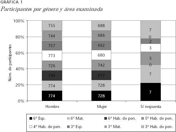 La gráfica 1 indica el número de estudiantes por género que contestaron los diferentes exámenes así como cuántos de ellos no lo presentaron. Como se puede observar, que el número de niñas y niños que respondieron a los exámenes aplicados es muy semejante. Por otro lado, fueron muy pocos los que no respondieron al examen o que se invalidó por carecer de algún dato.