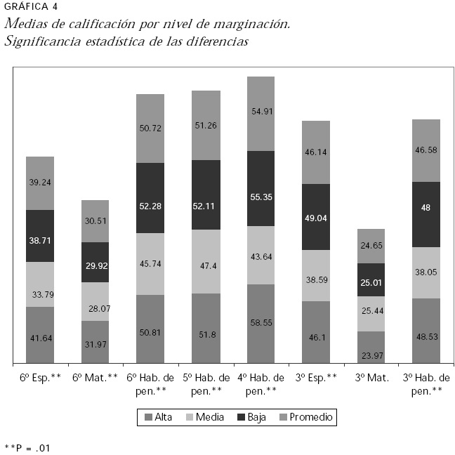 Las gráficas 3 y 4 muestran las medias de calificación por género y por nivel de marginación. También se indican la significancia estadística de las diferencias
