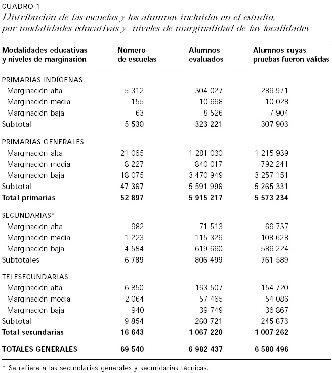 Como se puede apreciar en el cuadro 1, 1a información capturada en la base de datos que fue construida para realizar este estudio se refiere a 52 mil 897 escuelas primarias y a 16 mil 643 secundarias. La prueba Enlace fue aplicada a 6 millones 982 mil 437 alumnos inscritos en esos planteles (84.7% cursaba la enseñanza primaria y el 15.3% restante, la secundaria) Sin embargo, el análisis sólo se refirió a 6 millones 580 mil 596 alumnos (que representan el 94.2% de los primeros) porque, al depurar la información obtenida, la Secretaría de Educación Pública consideró que sólo las pruebas de esos estudiantes eran válidas.14