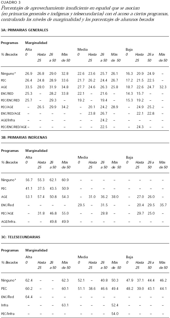 En estos porcentajes -que se encuentran en el cuadro 3 (A, B y C)- se apoyan los análisis realizados con la finalidad de estimar la eficacia académica de Oportunidades; así como la de los diferentes programas dirigidos a fortalecer la oferta escolar.