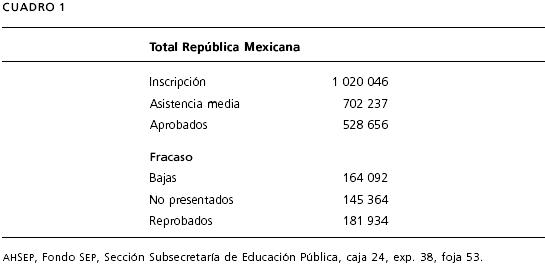 No obstante estas diversas maneras de aludir a la deserción en la Memorias oficiales, es un hecho que desde la década de los treinta el problema era visible y se hacían aproximaciones a él bajo diversas designaciones. En 1936, por ejemplo, la Oficina de Estadística Escolar de la Subsecretaría de Educación Pública elaboró un análisis sobre el movimiento de la población comparando asistencia media y aprovechamiento de los alumnos por estados de la República, titulado "Enseñanza primaria federal en la República. Comparación del movimiento: asistencia media y aprovechamiento de los alumnos. Números absolutos 19361937 y 1937". En la primera columna del lado izquierdo se enlistan las entidades y para cada una de ellas registra los datos de Inscripción, Asistencia media y Aprobados. En seguida viene una sección en la que, bajo el encabezado de "Fracaso", se reportan los datos sobre Bajas, No presentados y Reprobados. Los cálculos para cada uno de los aspectos referidos, en el total nacional se muestran en el cuadro 1.