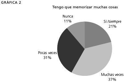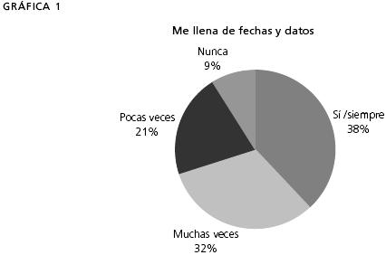 Estos resultados demuestran que uno de los objetivos del plan de 1993 (vigente en estas escuelas), evitar la memorización, no fue logrado, ya que 70% de los estudiantes plantea que la historia los llena de fechas y de datos y 58% sostiene que deben memorizar esos datos. Cuando realizamos las entrevistas fue muy común escuchar, por parte de los alumnos, que el estudio de la historia tiene que ver con la memorización, de eso se trata estudiar historia para ellos, pero como algunos dicen no estudiar para los exámenes no necesitan memorizar. Cuando les preguntamos si en los exámenes les evalúan fechas y nombres de grandes personajes, todos los entrevistados dijeron que sí. Pero esto no es cuestionado por los alumnos ya que sostienen que de eso se trata la historia.