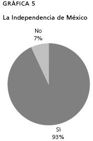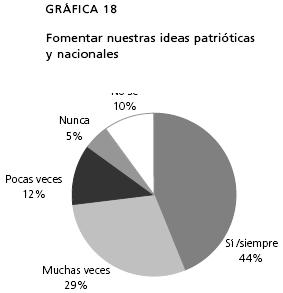 La gráfica 18 hace referencia a las ideas patrióticas, muestra que 73% de los estudiantes entienden que la historia es una mera herramienta para profundizar sentimientos patrióticos oficiales y, relacionan a la Patria con los grandes hombres. A eso se reduce simplemente la historia para los alumnos: a recordar nombres, fechas y héroes, es decir las "grandes épocas del desarrollo de la humanidad" (ESB, 1994:100), tal como dice el plan de 1993 y como sus maestros confirman.5 Nos parece importante relacionar este esquema con la pregunta sobre los actos cívicos que se llevan a cabo todos los lunes en las escuelas, ya que son para los alumnos una prolongación de las clases de historia. María José opina sobre dichos actos: "Nos da mucho el Sol y decimos que ya se acaben, que ya se acaben". Y ¿te gustan?: "No es tanto de que te gusten, es una costumbre que llevas en tu escuela". ¿Son necesarios?: "Al parecer creo que sí". "¿Pero para tu opinión?": "Yo creo que no".