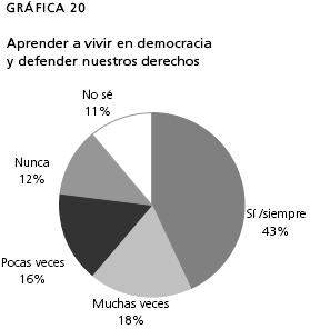 Por otra parte fue muy difícil que lograran definir qué es la democracia. Mónica dijo: "Es que cada quien vaya a votar", Bárbara: "Tener todos el mismo derecho", Daniel: "¿Democracia? ... otra pregunta", Verónica: "No sé", Carlos: "Con las elecciones alguien puede que voten y ellos digan que van a hacer cosas y no las hacen (sic)... eso es la democracia"; ¿Tú vas a votar cuando tengas 18? "Yo pienso que sí debo de votar a pesar de que no tomen en cuenta tu opinión...". El 70 % de los entrevistados respondió a la pregunta qué es la democracia: "no sé". Lo que nos lleva a relacionar estos comentarios con la gráfica correspondiente, que los alumnos no cuentan con una comprensión clara acerca del concepto y de lo que significa. De hecho los estudiantes rara vez se hallan frente a modos de conocimiento en los que se ensalcen las formas democráticas de la vida pública o que se les proporcionen las habilidades necesarias para hacer un examen crítico de la sociedad en la que viven.