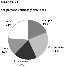 La gráfica 21 nos muestra que para los estudiantes la historia no logra formar, en su mayoría, a personas críticas; pero a partir de las conversaciones hemos notado que entienden que ésa no es una función de la historia, porque ésta se basa en estudiar cosas del pasado, con sus fechas y nombres respectivos y punto. Porque esto es lo que reciben de parte de sus maestros en las clases, quienes a su vez reciben estos conceptos como parte de su formación docente. Todo esto pone de manifiesto las contradicciones (o lo que también podríamos llamar el currículo oculto) del plan de 1993, dado que, por un lado, plantea evitar la memorización e impulsar el desarrollo de habilidades intelectuales que propicien la comprensión y, por otro, fomenta una historia positivista propia de los modelos didácticos de transmisiónrecepción.