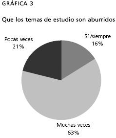 Ante la pregunta "Si tuvieras que mencionar algunos motivos que hacen que aprender historia sea difícil dirías", dos respuestas fueron esclarecedoras (gráficas 3 y 4). Estos resultados son muy elocuentes, 80% de los estudiantes dice que los aburren los temas de estudio, y casi 70% responde que la forma de enseñar del profesor es aburrida; el estudio de la historia no estimula la curiosidad de los jóvenes. Los testimonios que presentaremos a continuación refuerzan las respuestas de las gráficas y representan a alumnos de diferentes cursos, escuelas y maestros.
