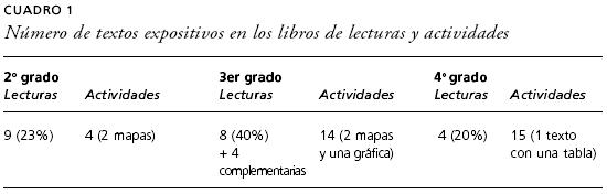 Como se puede apreciar en el cuadro 1, la presencia el texto expositivo en el libro de lecturas corresponde a sólo una quinta parte de los textos ofrecidos en segundo y cuarto grados, duplicando esta proporción en tercero. En cuanto a los libros de actividades, hay un salto importante en la presencia de estos textos entre segundo y tercer grados: de cuatro (incluidos dos mapas) se pasa a 14 (incluidos dos mapas y una gráfica); cantidad que se mantiene prácticamente igual en cuarto grado.