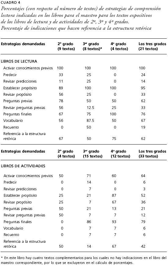 En este aspecto las indicaciones de los libros para el maestro muestran una progresión en las demandas, como se puede observar en el cuadro 4. Se pueden encontrar indicaciones referentes a la estructura retórica para 62% de los textos de los libros de lecturas y para 42% de los de actividades. Las tareas que se sugieren en este rubro son la elaboración de esquemas u organizadores gráficos, por regla general de descripción procesual y de listado simple; en ocasiones se deslizan explicaciones sobre los textos informativos y se hacen cuadros comparativos respecto de cómo está organizado el contenido en diversos tipos de texto; por ejemplo, se pide que se elaboren distinciones entre noticia y cuento, entre texto expositivo y leyenda o entre éste y noticia.