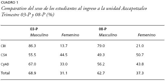 Un primer dato que nos interesa trabajar en el presente análisis comparativo tiene que ver con el sexo de los estudiantes. De acuerdo con las estadísticas institucionales, la unidad Azcapotzalco se ha caracterizado por contar con una alta proporción de estudiantes del sexo masculino debido, entre otros factores, a que en el campo de las ingenierías predomina aún la población masculina. En este sentido, en el cuadro 1, se puede apreciar que la generación que ingresó en el trimestre 03-P se caracteriza porque 68.9% pertenece al sexo masculino, mientras que en el caso de la generación 08-P, esta población disminuye a 62.7% y, por ende, se incrementan la presencia de estudiantes del sexo femenino. Particularmente, las divisiones académicas que exponen una mayor participación de las mujeres son Ciencias Básicas e Ingenierías que pasa de 13-7 a 21% y, sobre todo, en Ciencias y Artes para el Diseño de 33 a 43-8 por ciento.