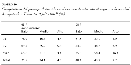De entrada, podemos señalar que con el cambio en la política de admisión, al combinar el puntaje obtenido en el examen de selección con un 25% el promedio del bachillerato, modificó tanto este último como el puntaje con que ingresan los estudiantes a la unidad Azcapotzalco. Si tomamos como referencia la generación 03-P identificamos que hay un 12% más de estudiantes en la generación 08-P con promedios entre 8 y 8.9, un 5-6% más con promedio de entre 9-0 y 10, y un descenso importante de 17-6 puntos porcentuales de los que ingresan con promedio de entre 7 y 7-9- Una mejoría que tampoco se había presentado en las generaciones de 2004 a 2007.
