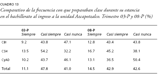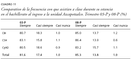 Por último, nos interesó conocer si la incorporación del promedio del bachillerato dentro del mecanismo de admisión a la UAM implicó que ingresaran alumnos con prácticas y hábitos de estudio diferenciados entre ambas generaciones. Si continuamos con la lógica que hemos seguido, se esperaría que al haberse incorporado una mayor cantidad de estudiantes con promedios entre 8 y 8.9 y un mejor desempeño en el examen de selección, encontraríamos una modificación positiva en el perfil de las prácticas y hábitos de estudio que declararon realizar durante su estancia en la educación media superior. En el caso de la frecuencia con que asistían a clase durante su estancia en el bachillerato no hay grandes cambios entre generaciones. De hecho, 81.6% de la generación 03-P afirmó que "siempre" lo hacía, en tanto, dentro de la 08-P asciende a 85-3%, lo cual hace una diferencia de 3-7 puntos porcentuales. El hábito de los sujetos, así como la práctica docente e institucional de obligar a los alumnos para que asistan a sus clases en el bachillerato, además de ser generalizada se sostiene en el tiempo (cuadro 11).