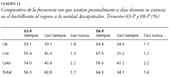 En el caso de la frecuencia de asistencia puntual a clases hay algunas diferencias que vale la pena mencionar. Notemos que 56.3% de la generación 03-P manifestó que asistía "siempre" con puntualidad a clase, en tanto, en la generación 08-P asciende a 64.3%. El mayor contraste se presenta en la división de CSH donde hay una diferencia positiva de 12 puntos porcentuales (cuadro 12).