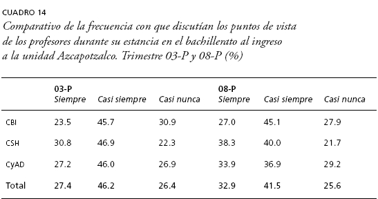 En este sentido, 27-4% de la generación 03-P nos contestó a su ingreso a la universidad que "siempre" discutía los puntos de vista de los profesores en el bachillerato, pero en el caso de la generación 08-P se incrementa ligeramente a 32.9%, siendo en la división de CSH donde se presenta la diferencia más importante pues pasa de 30.8% a 38.3% entre generaciones. Aunque es menor la diferencia a nivel general, habría que considerar que los estudiantes que ingresaron bajo la nueva política de admisión traen consigo, aunque sea parcialmente, formas distintas de interacción con sus profesores (cuadro 14).