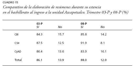 Cuando a la generación 03-P le preguntamos si elaboraban resúmenes durante su estancia en el bachillerato, 86.1% nos contestó que sí, y en el caso de la generación 08-P alcanzó 88%. No obstante que en la división de CYAD se denota un ligero descenso y en CSH el mayor aumento intergeneracional, las diferencias no son considerables y constata que se trata de una práctica habitual y generalizada entre los estudiantes del nivel medio superior (cuadro 15).