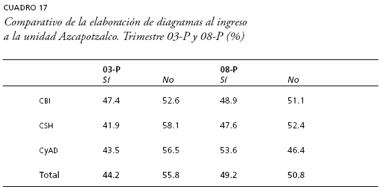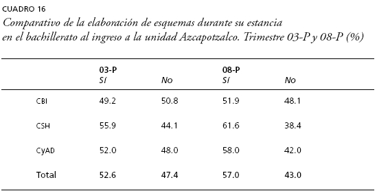 En el caso de la elaboración de esquemas existen diferencias entre generaciones, aunque no son de gran magnitud. Mientras que 52.6% de la generación 03-P realizaba esquemas como producto de la lectura en el bachillerato, la 08-P alcanzó 57%, siendo los cambios positivos más marcados en CSH, mientras que en CyAD disminuye el porcentaje de quienes afirman que elaboraban esquemas (cuadro 16).