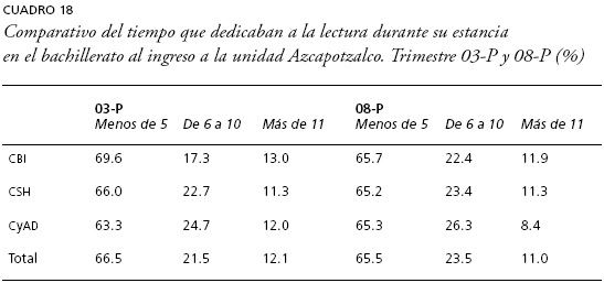 Analicemos ahora el tiempo que dedicaban a la lectura fuera del aula durante su estancia en el bachillerato. Si seguimos la lógica analítica que hemos planteado, se esperaría que, al haber ingresado una mayor cantidad de estudiantes con mejores promedios y desempeños en el examen de selección, hubiera una mayor proporción que dedicaran más tiempo a la lectura durante su estancia en el bachillerato. Los resultados que arroja la encuesta a nivel global expresan que no existen diferencias a destacar, prácticamente dos terceras partes de los alumnos de nuevo ingreso de ambas generaciones dedicaban menos de cinco horas a la semana a la lectura fuera del aula (cuadro 18).