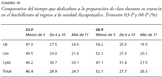 Ahora bien, ya sabemos que la amplia mayoría de los estudiantes dedicaba menos de 5 horas a la lectura fuera del aula durante su estancia en el bachillerato, pasemos ahora a analizar el tiempo que dedicaban a la preparación de clases. De nueva cuenta podríamos suponer que debido a que ingresaron estudiantes con mejores desempeños escolares, existiría la posibilidad de que dedicaran una mayor cantidad de tiempo a la preparación de clases en el nivel medio superior, pero lo que nos muestra el cuadro 19 es que se incrementó en sentido opuesto 5-7 puntos porcentuales la cantidad de estudiantes que dedicaba menos de 5 horas a la preparación de clases; y la división que expone el mayor contraste es CyAD con una diferencia negativa de 6.9 puntos porcentuales.