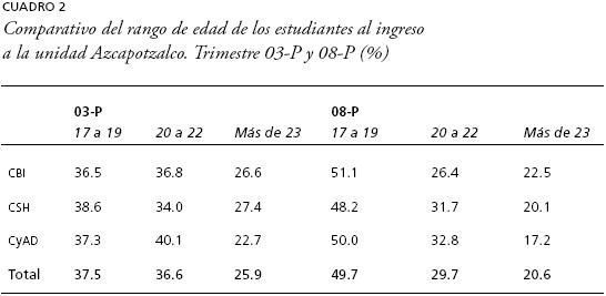 Otro indicador que consideramos pertinente incorporar en el análisis tiene que ver con la edad a la que ingresan a la unidad. El cuadro 2 muestra que la modificación en la política de ingreso a la UAM cambió el rango de edad. Nótese que en la generación 03-P sólo 37-5% de los estudiantes se encontraban dentro del rango de los 17 a 19 años, en cambio para la generación 08-P el porcentaje se incrementa a 49-7%. Una revisión del comportamiento del conjunto de la generaciones entre 2003 y 2007 arroja que 40.6% de la población ingresó en el rango de edad entre 17 y 19 años, proporción que, en promedio, también es menor en comparación con el 2008. En el caso de las divisiones académicas se presenta un comportamiento semejante al observado a nivel general, pues las tres divisiones incrementan la participación de los jóvenes entre los 17 y 19 años en un poco más de 10 por ciento.