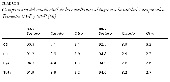 En todas las investigaciones que hemos realizado sobre los perfiles de los estudiantes en la UAM y en otras instituciones de educación superior del país, tanto públicas como privadas, más de 90% son solteros (De Garay, 2001 y 2006). Esa constante demográfica se repite en este estudio. Los resultados indican que entre la generación que ingresó en el trimestre 03-P y la que ingresó en 08-P sólo hay dos puntos de diferencia, lo cual nos lleva a concluir que no se modificó sustancialmente el estado civil de los estudiantes a su ingreso. No deja de llamar la atención el alto segmento de la población estudiantil que al continuar sus estudios de formación profesional en el nivel superior han aplazado la posibilidad de contraer matrimonio. Es un dato significativo si se toma en cuenta que el promedio de edad en el que se establecen relaciones matrimoniales en México es de 19 años según datos del Instituto Nacional de Geografía y Estadística (INEGI, 2000). Mientras la mayoría de la población joven que no accede o abandonó la educación superior está casada, los estudiantes universitarios han decidido postergar dicho compromiso de vida; sin duda, comportamientos sociales claramente distintos (cuadro 3).