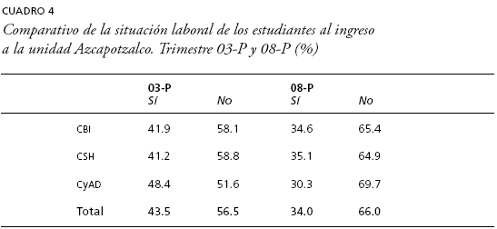 En este marco, nos preguntábamos si ha variado la situación laboral de los estudiantes a su ingreso. Los resultados muestran que la condición de estudiante-trabajador, en tan solo cinco años, varió considerablemente entre ambas generaciones, pues en el trimestre 03-P alcanzaba a 43-5% de la población, en cambio, en el trimestre 08-P disminuyó a 34% (cuadro 4). Esta diferencia también es palpable al observar el comportamiento de la generaciones de 2003 a 2007 que, en promedio, 41.1% declaró trabajar al momento de ingresar a la UAM. Entre divisiones académicas destaca, por mucho, el caso de CyAD pues disminuyó en 18.1% el porcentaje de alumnos que trabajan y estudian entre una generación y la otra. Ante estos datos, es conveniente formularse la siguiente pregunta: ¿fue la modificación en la política de ingreso la que alteró el perfil de los estudiantes, disminuyendo las posibilidades de admisión a los estudiantes-trabajadores? Nuestra respuesta es que no tenemos aún suficientes elementos para contestar afirmativamente, será preciso, para confirmarlo, hacer un seguimiento a futuras generaciones que han ingresado con el nuevo mecanismo. Lo cierto es que en transcurso de 2003 a 2007 la proporción de estudiantes que trabajaban al ingreso superaba, en promedio, 40%, mientras que en la generación de 2008 se redujo a 34 por ciento.
