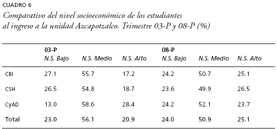Analicemos ahora el comportamiento entre generaciones atendiendo a su perfil socioeconómico. Lo primero que salta a la vista al observar el cuadro 6 es que, a nivel global, no se presentan variaciones importantes en el nivel que definimos como bajo, pues aumentó sólo de 23 a 24%, pero en el caso del nivel medio disminuye la presencia de este sector de 56.1 a 50.9%, con lo que se incrementan los alumnos con un perfil socioeconómico alto al pasar de 20.9% a 25-1%. Sin embargo, poniendo atención al comportamiento de las divisiones académicas aparecen algunas variaciones que es necesario anotar.