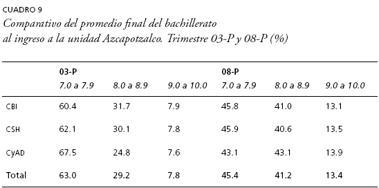 Iniciemos el análisis por el promedio del bachillerato. Un primer dato que salta al observar el cuadro 9 es que el cambio en la política de admisión modificó sustancialmente el promedio final del bachillerato con que acceden a la unidad Azcapotzalco los aspirantes admitidos. Nótese que entre la generación 03-P y la 08-P la diferencia porcentual dentro del grupo que obtuvo un promedio de calificaciones de 9 a 10 es de 5-6 puntos, al pasar de 7-8 a 13-4%, comportamiento que se presenta de manera semejante en las tres divisiones académicas. En tanto, la mayor variabilidad se presenta dentro del grupo de 8 a 8.9, debido a que en la generación 03-P alcanzaba 29-2% de la población mientras que en la 08-P se incrementa a 41.2%, lo cual se traduce en una variación de 12 puntos, siendo que entre las divisiones académicas la variabilidad es parecida. Por añadidura, la proporción de estudiantes con promedio de 7-0 a 7-9 disminuyó de manera importante debido a que pasó de 63 a 45-4%, nada menos que 17-6 puntos. Este dato es muy relevante en la historia reciente de la unidad Azcapotzalco, pues por primera vez menos de la mitad de los estudiantes ingresó con un promedio por debajo de ocho. De hecho, 60% de las generaciones de 2003 a 2007 ingresaron con un promedio de calificaciones entre 7 y 7-9, y sólo 7% entre 9 y 10.