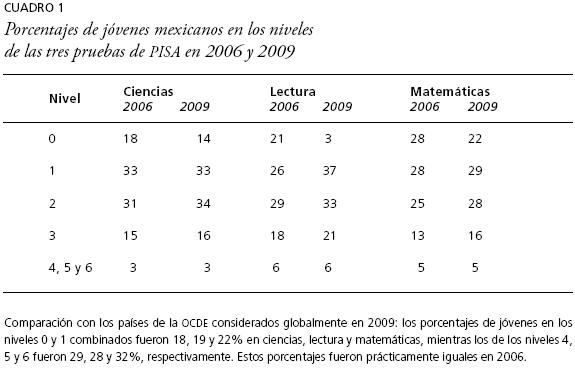 Como es bien sabido, los resultados de México en los estudios de TIMSS y PISA no son alentadores. En México sólo participó en 1995 y a petición del gobierno mexicano los resultados no se hicieron públicos, pero los resultados de pisa sí se han publicado; recientemente se conocieron los de la aplicación de 2009 y los medios insistieron en que hemos mejorado en comparación con la aplicación de 2006. Esto es cierto (cuadro 1); por ejemplo, el porcentaje de jóvenes ubicados en los niveles cero o uno de las pruebas de habilidades científicas, de lectura y matemáticas bajó de 51 a 47%, de 47 a 40% y de 56 a 51%, respectivamente. Sin embargo, sigue siendo cierto que prácticamente la mitad de nuestros jóvenes se mantiene en esos niveles, por lo que están "poco calificados" no sólo para pasar a los estudios superiores sino también para resolver problemas elementales (INEE, 2010 y 2011).