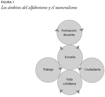Los distintos ámbitos en los que pueden considerarse tanto el alfabetismo como el numeralismo forman círculos "viciosos" interrelacionados (o virtuosos, según se los quiera mirar) (figura 1): lo que se aprende y se ejerce en la escuela afecta a la vida cotidiana, al trabajo, a la ciudadanía, y lo que se aprende y ejerce en estos tres ámbitos afecta también a los demás.