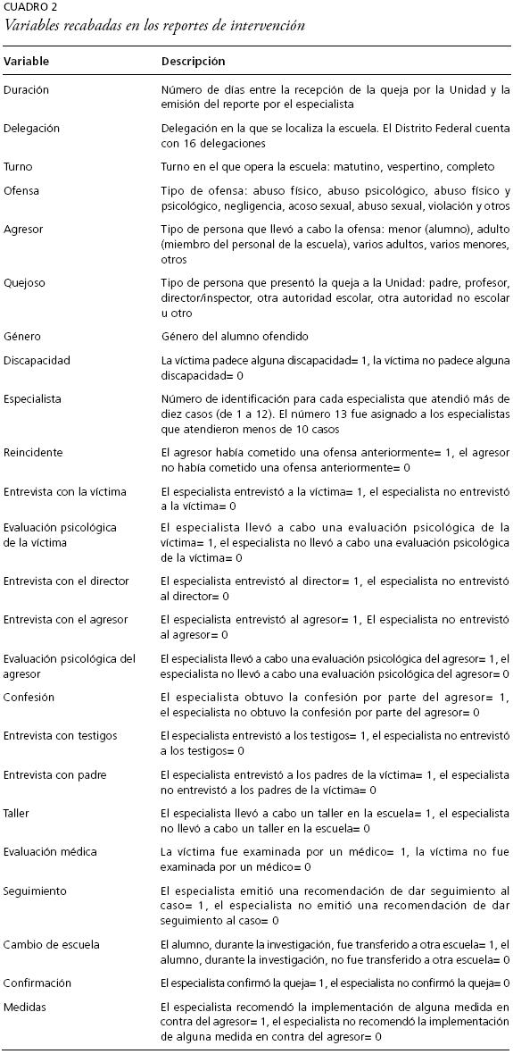 Se utilizan datos contenidos en 109 informes de intervención realizados en el periodo de febrero de 2002 a mayo de 2007. Todos corresponden a quejas por abuso y/o acoso sexual presuntamente cometido por miembros del personal escolar de planteles públicos de educación primaria del Distrito Federal.5 Usualmente, la estructura de un informe de intervención es la siguiente: al inicio del reporte hay un recuadro con los datos de la escuela (nombre, nivel, turno, domicilio, teléfono y nombre del director), posteriormente se anota la fecha en que se emite, el especialista responsable de la investigación, la fecha y el motivo de la denuncia, una descripción del caso (que puede ser extensa si así lo amerita), una enumeración de las acciones de intervención y atención emprendidas por el especialista y, finalmente, se presentan los resultados, sugerencias y observaciones. El cuadro 2 describe las variables recopiladas a partir de los informes de intervención.