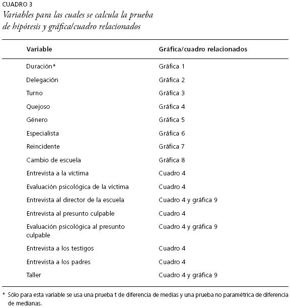 El cuadro 3 presenta las variables para las cuales se calcula una prueba de hipótesis, así como la gráfica/cuadro relacionados. El mismo orden que lleva el cuadro es el que siguen los resultados presentados en esta subsección.