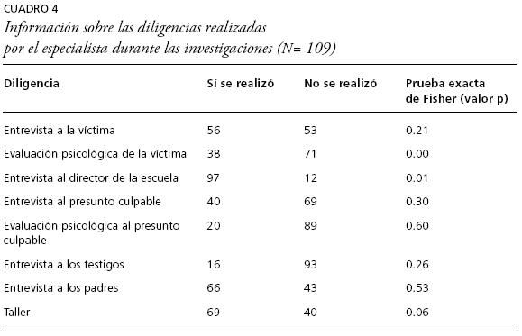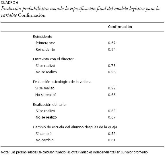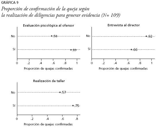 Segundo, los resultados relativos a las diligencias que se siguen dentro del proceso investigativo que realiza el especialista al interior del plantel, y cuya ocurrencia sesga, según la evidencia estadística, la confirmación de la queja. Estas son la entrevista con el director, la evaluación psicológica de la víctima y la realización del taller.