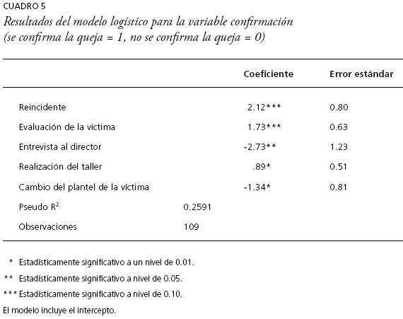 Con el fin de ponderar debidamente los resultados del presente estudio, debe abundarse sobre las limitantes de la información que contienen los informes de intervención. Dado que éstos fueron creados como una herramienta de control administrativo dentro de la Unidad, carecen de datos sobre el estatus socioeconómico del alumno, su edad y de algún indicador sobre el estado psicológico del menor. La falta de esta información podría constituir una limitante para un ejercicio de correlación, pues en una investigación realizada en Estados Unidos de América por Hussey et al. (2005:481), se probó que tales variables tienen una relación significativa con el resultado de la substanciación de la queja. Así, aunque los resultados de la regresión logística presentados en el cuadro 4 podrían cambiar si tuviéramos más información sobre las características del alumno, es creíble pensar que los resultados más robustos se mantendrían, particularmente, el que la probabilidad de confirmar la queja tenga una relación estadísticamente significativa con el hecho de que el ofensor sea reincidente.