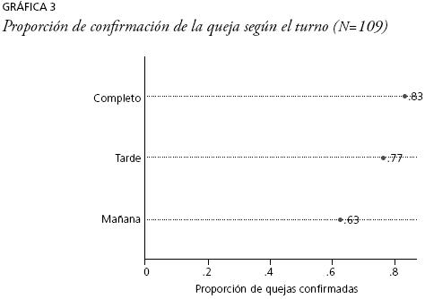 En la gráfica 3 se observa la proporción de confirmación de quejas según el turno de la escuela donde se originó la misma. Las frecuencias de esta variable son: 67 matutino, 30 vespertino y 12 turno completo. La mayor incidencia de las quejas en el turno matutino puede deberse a que estos alumnos tienen características que los hacen más propensos a iniciar una queja.9 Por ejemplo, en algunos informes de intervención que los involucran, es claro que los padres están muy pendientes de la situación de su hijo(a), por lo que están dispuestos a invertir tiempo en iniciar una queja, máxime cuando perciben que éste(a) ha sido víctima de alguna ofensa de tipo sexual por parte de algún miembro del personal escolar. Aunque hay diferencias entre las proporciones de confirmación según el turno, una prueba estadística no respalda la existencia de un sesgo en el resultado de la queja por turno.10