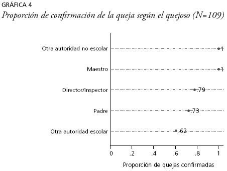 La gráfica 4 muestra la proporción de confirmación de quejas según el tipo de entidad/persona que la interpone (quejoso). Las frecuencias de la variable quejoso son las siguientes: padre (11), maestro (10), director/ inspector (14), otra autoridad escolar (73) y otra autoridad no escolar (1). En la categoría de "otra autoridad escolar" se agrupan instancias de la SEP,11 a donde regularmente acude el padre a presentar la queja, la cual finalmente es canalizada a la Unidad. Con base en los resultados de una prueba estadística, se respalda la existencia de un sesgo en el resultado de la queja según el quejoso.12 Así, se confirman con una mayor proporción cuando el quejoso es un maestro u otra autoridad no escolar y, en menor medida, cuando es otra autoridad escolar.