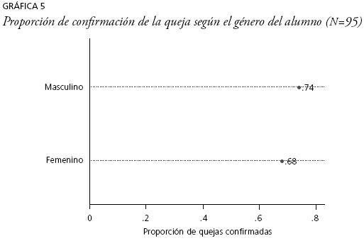 Tercero, el resultado referente al cambio de escuela del alumno después de iniciado el proceso de queja. En varios informes de intervención, los especialistas argumentan que no fue posible seguir con el procedimiento para sustanciar la queja, pues el alumno fue cambiado de plantel. Según ellos, los cambios de plantel de la víctima suelen obedecer al deseo de sus padres o de los propios estudiantes de evitar seguir confrontando al presunto ofensor, o bien, de continuar como parte de un proceso administrativo desgastante (que incluso llega a involucrar posicionamientos de otros docentes o alumnos que toman represalias en contra del afectado). La evidencia estadística indica que el hecho de que el alumno se haya cambiado de escuela en el transcurso de la investigación sesga el resultado de la queja. Fijando las otras variables independientes en su promedio, la probabilidad de confirmar la queja dado que el alumno se cambió de escuela es de 0.52, mientras que cuando no se cambió es de 0.81. Dos reflexiones se desprenden de esta cifra. La primera, la necesidad de la creación de procedimientos administrativos que protejan a la víctima de un entorno escolar potencialmente hostil derivado de su decisión de interponer una queja contra de su presunto ofensor. La segunda, la importancia de modificar el procedimiento administrativo que siguen los especialistas de forma tal que sea obligatorio para éstos el seguimiento de los casos, incluso cuando ya no se cuenta con la cooperación del quejoso, siendo un ejemplo claro de no cooperación, el cambio de escuela del alumno.