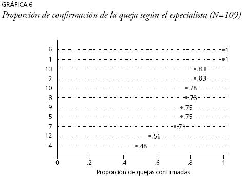 La gráfica 5 presenta la proporción de confirmación de quejas según el género de la víctima. Las frecuencias para la variable género son las siguientes: 19 masculino, 76 femenino y 14 no disponible.13 Una prueba estadística no respalda la existencia de un sesgo por género en el resultado de la queja.14 En la gráfica 6 se ve la proporción de confirmación de quejas según el especialista que se encargó de la investigación. La mayor parte fueron investigadas por tres especialistas. Dado que sus nombres son confidenciales, se hace referencia a ellos con números: el especialista 4 atendió 21 casos; el 7 atendió 21 casos y el especialista 12 atendió 16. Ninguno de los otros especialistas atendió más de 8 casos. Una prueba estadística no respalda la existencia de un sesgo por especialista en el resultado de la queja.15