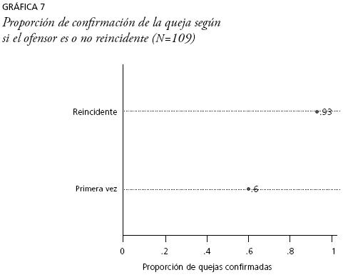 La gráfica 7 muestra la proporción de confirmación de quejas según si el presunto ofensor es o no reincidente. Las frecuencias para la variable reincidencia son las siguientes: 80 quejas involucran ofensores de primera vez y 29 involucran a reincidentes. Este resultado es de gran importancia, pues pone en evidencia el hecho de que varios de los miembros del personal escolar involucrados en quejas por abuso y/o acoso sexual, ya habían sido acusados con anterioridad por cometer las mismas faltas. 16Además, una prueba estadística respalda la existencia de un sesgo en la confirmación de la queja dependiendo de si el presunto ofensor ha cometido previamente una ofensa en contra de la integridad de un menor.17