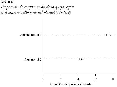La gráfica 8 presenta la proporción de confirmación de quejas dependiendo de si el alumno salió o no del plantel en el curso de la investigación. Las frecuencias para esta variable son: 12 quejas donde alumno salió y 97 donde no salió. Algunos informes refieren casos donde la víctima y sus padres enfrentan situaciones incómodas que los llevan a tomar la decisión de que el alumno salga de la escuela, por ejemplo, represalias del ofensor, otros miembros del personal escolar u otros estudiantes. Una prueba de hipótesis respalda la existencia de un sesgo en el resultado de la queja dependiendo de si el alumno salió o no del plantel durante el transcurso de la investigación.18 Este resultado es relativamente lógico, pues una vez que la víctima sale de la escuela, usualmente ni ella ni sus padres están dispuestos a seguir colaborando en la investigación, lo que complica las labores del especialista.