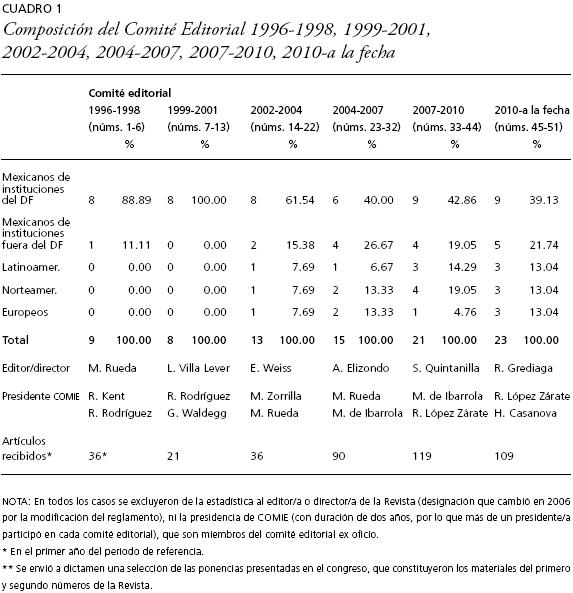 El reglamento estipula que el Comité Editorial en funciones proponga a los nuevos integrantes del Consejo y del Comité editoriales, quienes serán aprobados por el Comité Consultivo del COMIE. La integración del Consejo Editorial se revisa cada cuatro años. Los miembros del Comité Editorial también duran en sus funciones cuatro años, pero cada dos cambia el 50 por ciento de sus miembros, lo que permite simultáneamente la continuidad y renovación del trabajo de gestión editorial de la misma. Como puede observarse en el cuadro 1, aunque con fluctuaciones, se ha mantenido una tendencia creciente en la cantidad de artículos recibidos, que explica el aumento en el número de integrantes del Comité y Consejo editoriales.