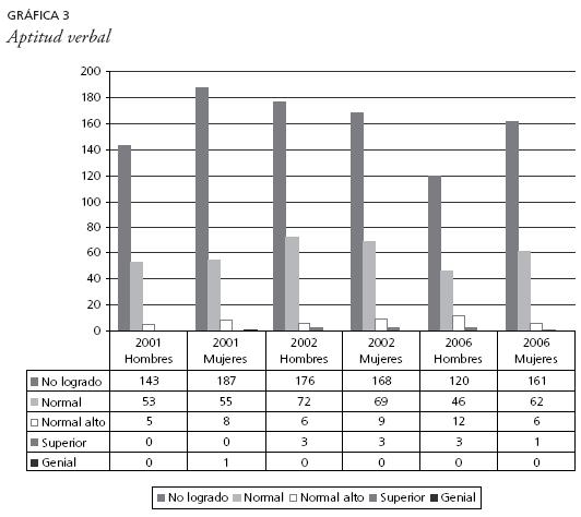 En la aptitud verbal, promoción 2001, 27% de alumnos alcanza niveles de desarrollo normal; en el egreso 2002 lo obtiene 32%, y la promoción 2006 muestra un 68.36% en nivel de no logrado.