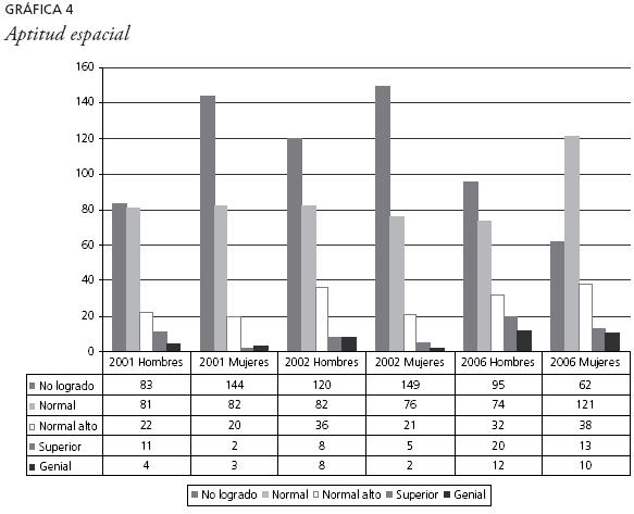 Entre las mujeres, 58.89%, se encuentra en la categoría de no logrado (149 de ellas); 30.04% en la normal (76 alumnas); 8.3% normal alto (21 estudiantes); 1.98% se sitúa en la superior (5 egresadas); 0.79% corresponde al nivel más alto de genial (2 chicas). En la población en análisis de 2002, 53.06% no alcanza la categoría normal en la aptitud espacial, sí la logra 46.94% de los estudiantes.