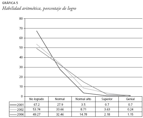 En la habilidad aritmética de la promoción 2001, 27.9% de los alumnos posee un nivel de desarrollo normal, es decir, pueden resolver operaciones aritméticas de una manera rápida y exacta. En cuanto a los egresados en 2002, bajo el paradigma con reforma educacional, 53.75% no tiene esta habilidad; mientras que los estudiantes de la promoción 2006 muestran un nivel de logro de 50.19% en este rubro.