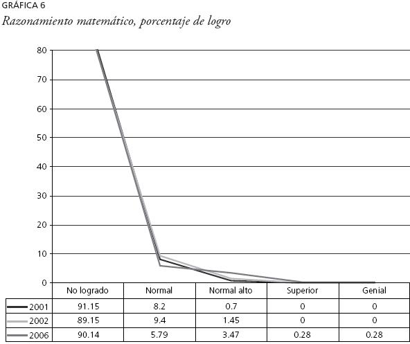 De los varones egresados en 2006, 43.62% se encuentra en la categoría de no logrado, 33% en normal, 18.62% se sitúa normal alto, 3.19% en superior y sólo 1.59% alcanza el nivel de genial. Respecto de las mujeres, 56.05% se ubica en la categoría de no logrado, 31.8% en la de normal, 10.1% está en el nivel de logro normal alto, es decir, 16 alumnas obtuvieron un puntaje que oscila entre 22 y 24; 1.27% se ubica en la categoría de superior (2 estudiantes alcanzaron entre 25 y 26 puntos); y finalmente, 0.63% en el nivel de genial (una alumna logró entre 27 y 50 puntos).
