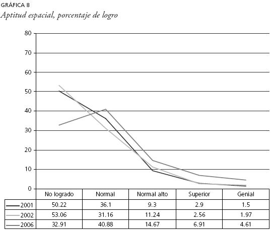 En la aptitud espacial, 50.22% de los estudiantes de cuartos medios del egreso 2001 no poseen la habilidad para pensar visualmente en formas geométricas y comprender las relaciones que se establecen entre la representación de objetos bidimensionales con su correlato tridimensional; sólo alcanzan niveles de desarrollo normal 49.8% de la población en estudio. En la población en análisis de 2002, 53% no alcanza niveles normales en la aptitud espacial; sí desarrolla esta habilidad 46.9%. En el grupo de 2006, 32.91% tiene un nivel de no logrado.