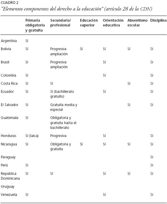 Los códigos diferencian, en la mayoría de los casos, los contenidos de los artículos 28 y 29 de la CDN. Con respecto al primero podemos observar en el cuadro 2 una serie de categorías o indicadores que así lo definen: derecho a la educación primaria, obligatoria y gratuita; acceso a la educación secundaria y profesional; acceso a la educación superior; orientación educativa; absentismo escolar y disciplina, haciendo constar la implementación o no de los mismos por cada uno de los países.