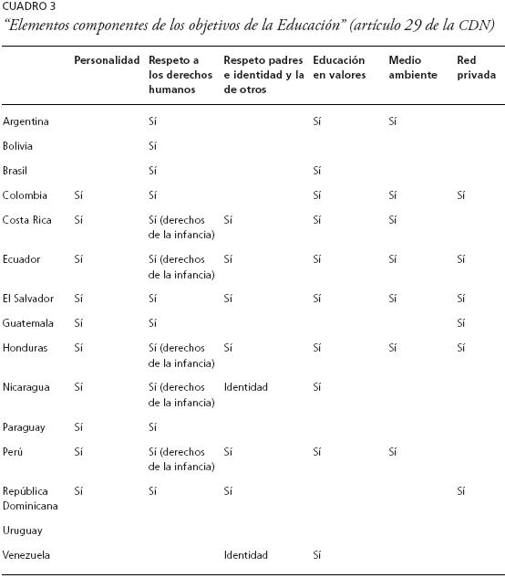 El Comité de los Derechos del Niño se ha preocupado especialmente de este artículo y realizó, en 2001, una observación general al respecto, señalando la interpretación que debía dársele (Comité de los Derechos del Niño, 2001). Este artículo se interpreta de una manera amplia ya que se refiere tanto a aspectos propios del desarrollo de la infancia como otros más curriculares, como que la educación debe ser respetuosa con los derechos humanos. La mayoría de los países hacen mención a estos objetivos, destacando la formación de la ciudadanía. Con respecto al desarrollo de la personalidad, todos los códigos, excepto Argentina, Bolivia, Brasil, Panamá, Uruguay y Venezuela, refieren que la educación debe ir encaminada al "desarrollo de la personalidad", en función de la edad y características de los niños. También tiene importancia reconocida el respeto a los derechos humanos y las libertades fundamentales, pues todos los países, excepto Brasil, Panamá, Uruguay y Venezuela se refieren al mismo. Además. Costa Rica, Ecuador, Honduras, Nicaragua, Paraguay y Perú señalan la necesidad de incluir los derechos de la infancia. En ese sentido, la introducción de programas de Educación en derechos humanos en el currículum escolar tiene ya una tradición en el área, como lo prueban los estudios sobre "Educación en derechos humanos" (Gutiérrez, 2006 y Magendzo, 2010).